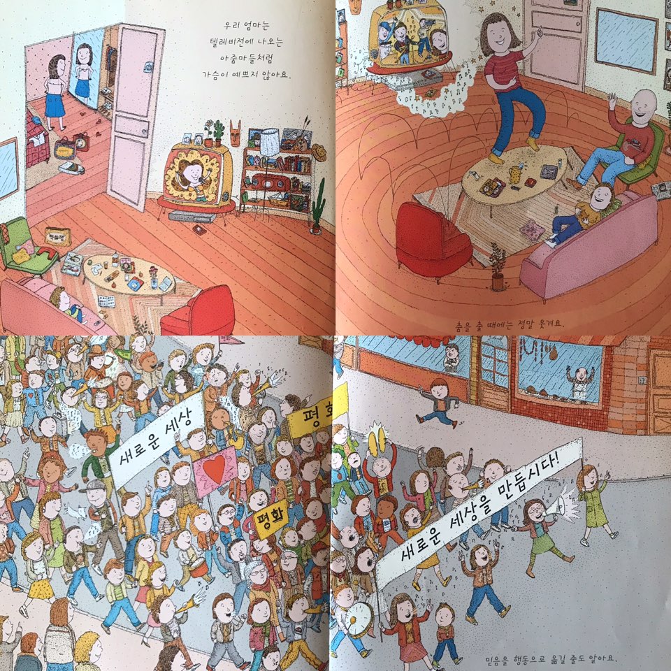 위 그림은 '못말리는 우리 엄마'라는 그림책입니다. 그림책 속 엄마는 다리에 털이 부숭하고 텔레비전에 나오는 사람들처럼 예쁘지도 않고 겨드랑이에 땀이 나면 지독한 냄새가 나기도 합니다.노래를 부를 땐 접시깨지는 소리가 나고 춤을 출 땐 정말 웃기지요.하지만 엄마는 내가 힘들고 지치면 다정히 위로해주고 어려운 이웃들을 위해 봉사하고 시위에 참여하며 믿음을 행동으로 옮길 줄 압니다. 전 이 그림책을 보고 '이 엄마는 페미니스트가 분명해!'라고 생각했습니다. 책에는 페미니즘이나 여자, 남자라는 단어가 한번도 나오지 않습니다. 하지만 엄마는 미디어가 쏟아내는 아름다움의 틀에 갇히지 않고, 잘 못해도 춤추고 노래하며 즐거워합니다. 약자를 위해 행동하고 가족 안에서는 사랑이 넘칩니다. 그리고 스스로를 매우 사랑하지요.